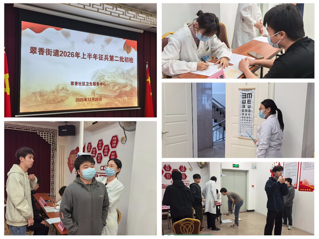 为深入贯彻国家征兵工作部署,助力提升军队整体素质,扎实推进翠香街道征兵体检工作,确保为部队输送身体健康、素质过硬的优秀兵员,2025年12月25日,在翠香街道武装部统一安排下,翠香社区卫生服务中心组织实施了2026年上半年征兵第二批初检。