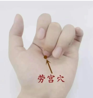 握拳屈指时,中指尖所指的位置即为劳宫穴。手掌中央,横平中指与无名指之间的指蹼缘。